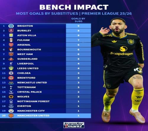 北京时间1月28日,德转统计出了本赛季至今英超球队替补进球数排行榜,布莱顿依靠替补球员打入9球排名第一,曼城和曼联替补球员仅打入1球排名垫底。